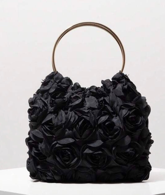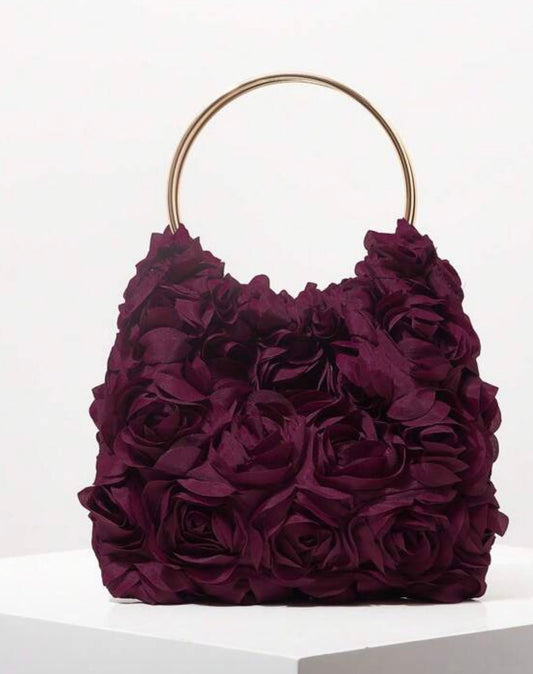 This cute bag is covered in soft roses w/gold rounded handle w/and inside zipper pocket