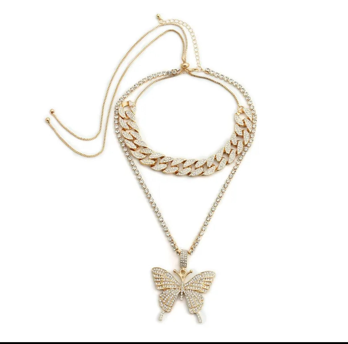 2 layer Rhinestone Cuban link chain, and Rhinestone Chain w/ Butterfly Pendant