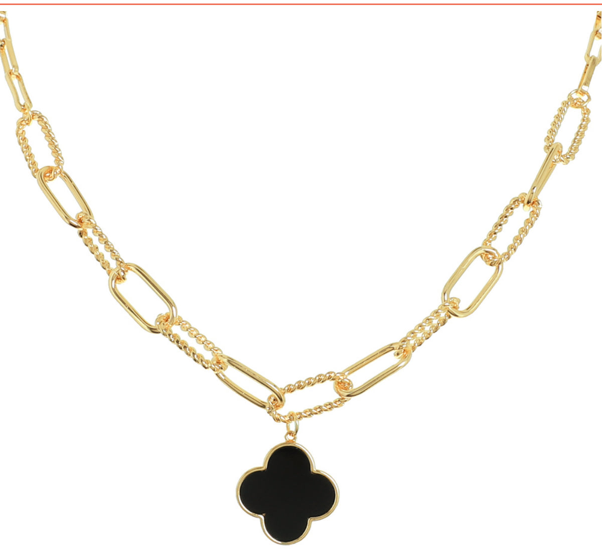 Quatrefoil paper clip chain w/clover pendant
